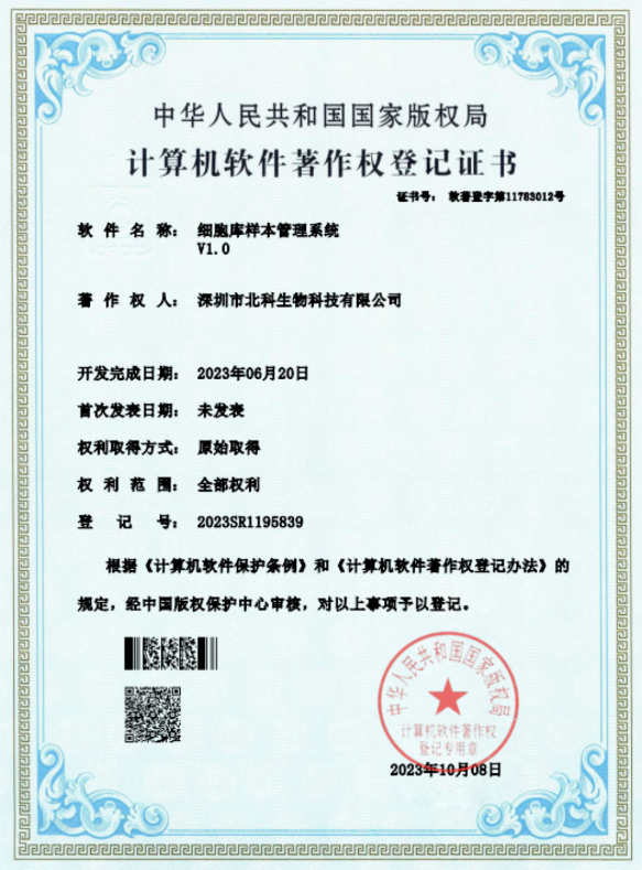 2023年10月8號,北科生物制備中心細胞庫團隊自主研發(fā)軟件系統(tǒng)——”細胞庫樣本管理系統(tǒng)”通過國家版權(quán)局審核,獲得了《計算機軟件著作權(quán)登記證書》。該軟件系統(tǒng)分為8大核心模塊,通過軟件對在庫樣本從交接、