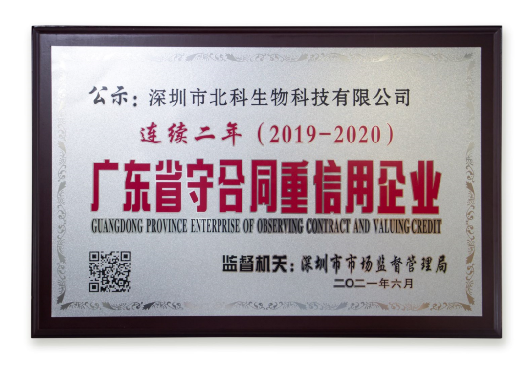 近日,廣東省市場(chǎng)監(jiān)督管理局公布了2020年度廣東省守合同重信用企業(yè)名單。深圳市北科生物科技有限公司順利通過(guò)最終評(píng)審,連續(xù)兩年榮獲“廣東省守合同重信用”榮譽(yù)稱號(hào),并獲頒榮譽(yù)證牌匾和榮譽(yù)證書(shū)。“廣東省守合