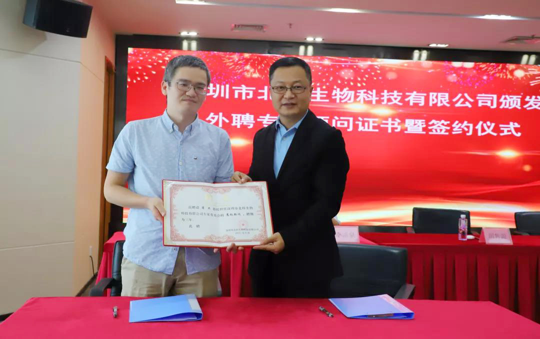 9月29日下午,為推動(dòng)公司實(shí)現(xiàn)高質(zhì)量的發(fā)展,提升公司的核心競(jìng)爭(zhēng)力,深圳市北科生物科技有限公司舉行了頒發(fā)外聘專家顧問(wèn)證書(shū)暨合作項(xiàng)目簽約儀式。北科生物董事長(zhǎng)胡雋源博士與蔣衛(wèi)教授簽訂《合作項(xiàng)目意向書(shū)》并頒發(fā)