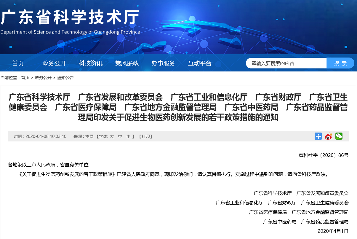 2020年4月8日,廣東省科學(xué)技術(shù)廳、廣東省發(fā)展和改革委員會(huì)、廣東省工業(yè)和信息化廳、廣東省財(cái)政廳、廣東省衛(wèi)生健康委員會(huì)、廣東省醫(yī)療保障局、廣東省地方金融監(jiān)督管理局、廣東省中醫(yī)藥局、廣東省藥品監(jiān)督管理局