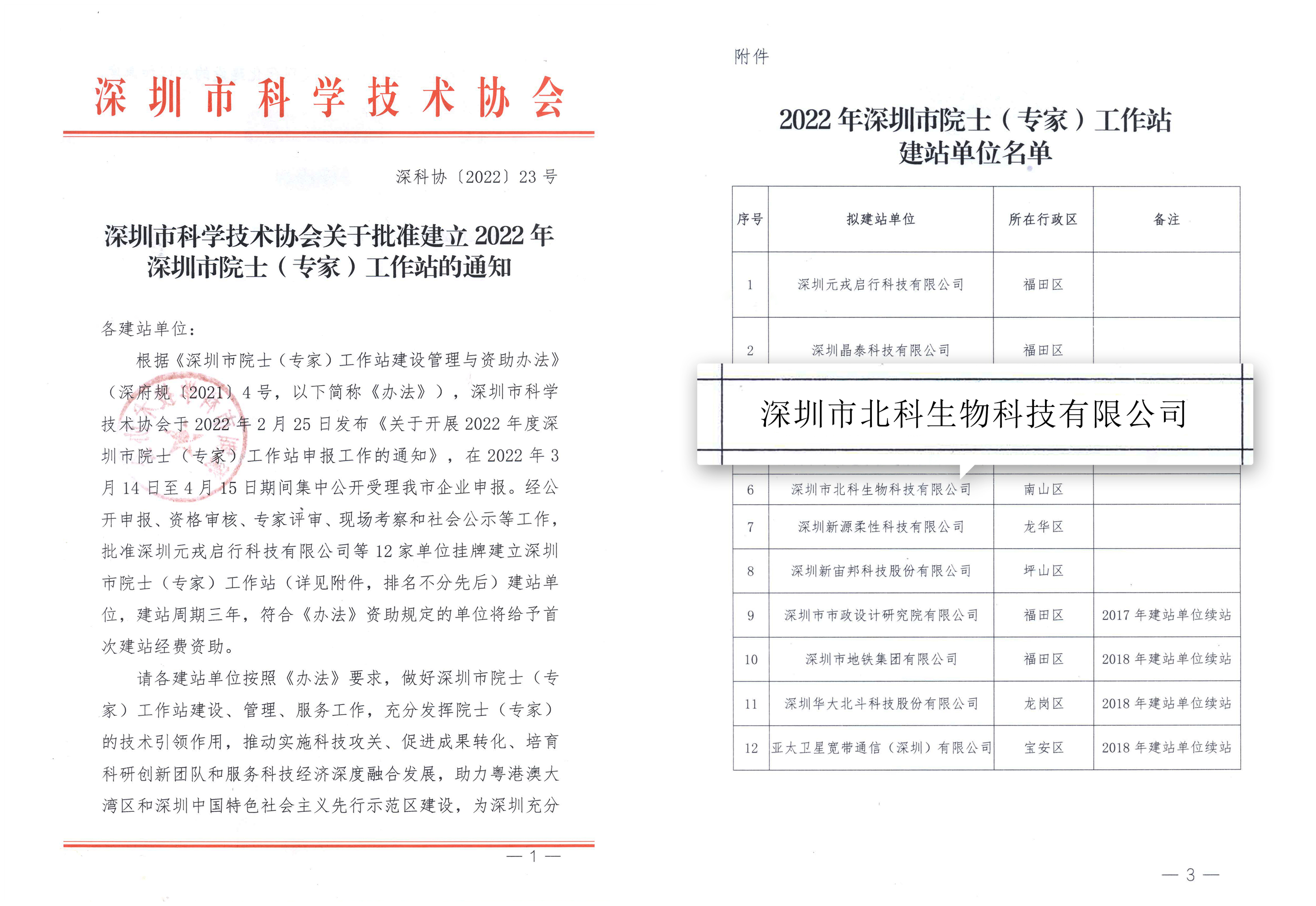 2022年6月27日,深圳市科學技術協(xié)會發(fā)布通知,按照《深圳市院士(專家)工作站建設管理與資助辦法》(深府規(guī)〔2021〕4號)有關要求,經過公開申報、資格審核和專家評審、現(xiàn)場考察和社會公示等工作,同意深圳市北科生物科技有限公司建立深圳市院士(專家)工作站。