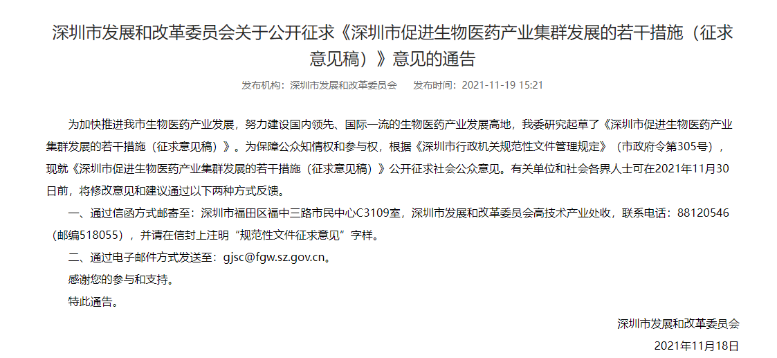 近日,為落實(shí)《中共中央 國務(wù)院關(guān)于支持深圳建設(shè)中國特色社會(huì)主義先行示范區(qū)的意見》《深圳市關(guān)于進(jìn)一步加快發(fā)展戰(zhàn)略性新興產(chǎn)業(yè)的實(shí)施方案》(深府〔2018〕84號)等政策精神,充分銜接《深圳市促進(jìn)生物醫(yī)藥產(chǎn)業(yè)集聚發(fā)展指導(dǎo)意見》及相關(guān)配套文件(深府辦〔2020〕2號),加快推進(jìn)我市生物醫(yī)藥產(chǎn)業(yè)發(fā)展,努力建設(shè)國內(nèi)領(lǐng)先、國際一流的生物醫(yī)藥產(chǎn)業(yè)發(fā)展高地,深圳市發(fā)改委研究起草了《深圳市促進(jìn)生物醫(yī)藥產(chǎn)業(yè)集群發(fā)展的若干措施(征求意見稿)》。