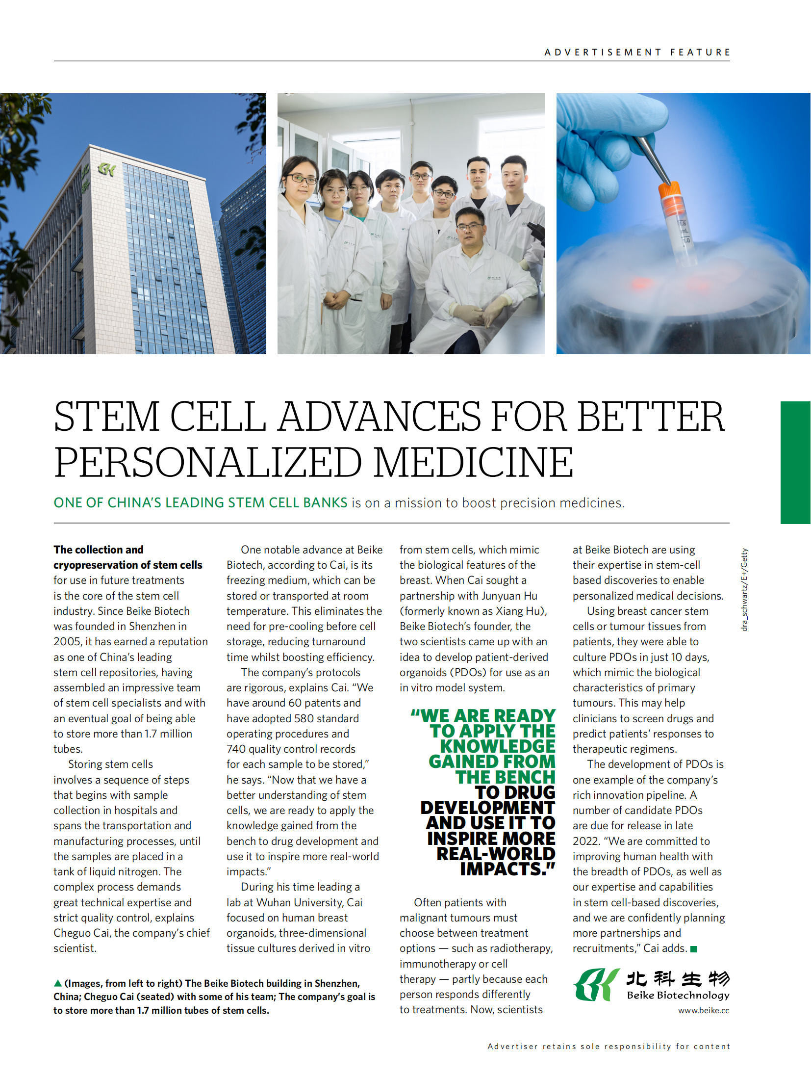 2022年6月29日,《Nature》官網(wǎng)nature spotlight增刊的“自然聚焦-中國精準(zhǔn)醫(yī)療”板塊在線發(fā)表了北科生物首席科學(xué)家蔡車國教授團(tuán)隊的主題文章:干細(xì)胞進(jìn)展推動更好的個性化醫(yī)療。干細(xì)胞進(jìn)展推動更好的個性化醫(yī)療