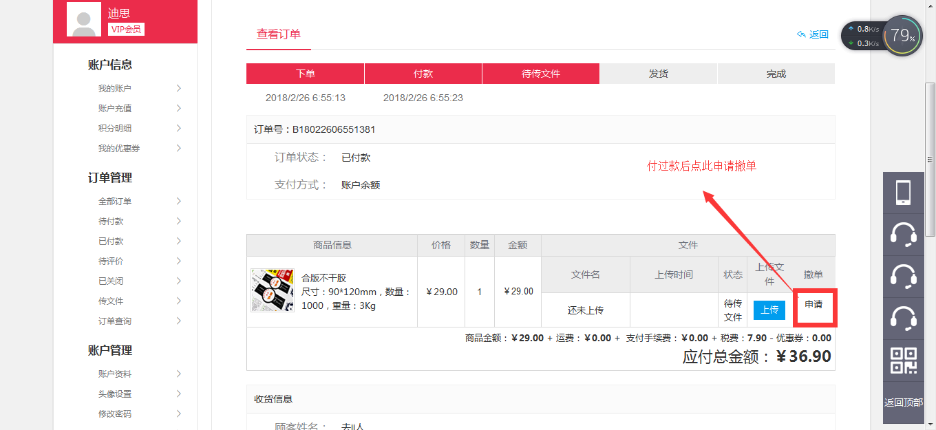 下單成功后的訂單沒有進入印刷狀態(tài)時,可直接申請撤單,無需人工干預實現(xiàn)秒退款;