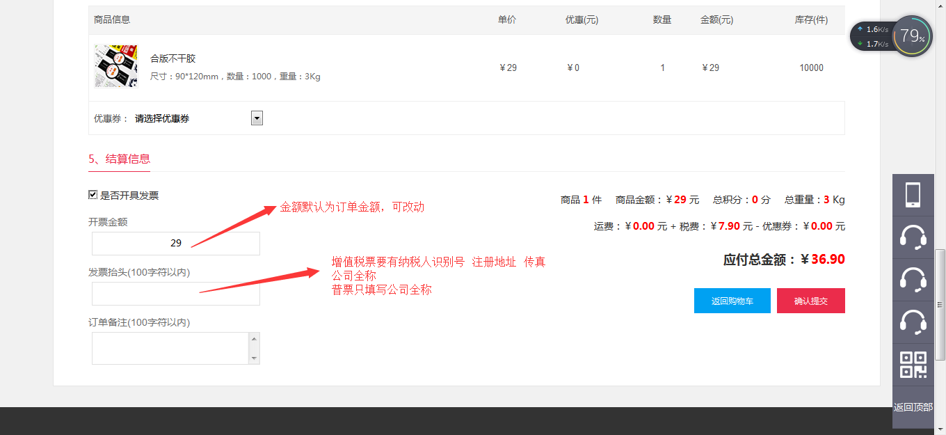 7、開具發(fā)票:請在下單時勾選發(fā)票項,稅金和5元快遞費會自動計算在貨款內(nèi),財務后臺看到需開發(fā)票會及時開具,并按收貨地址快遞寄出,發(fā)票不再隨貨走。如需開具發(fā)票,請把開票信息填寫完整,如沒有完整的開票信息,財務將按普票開。發(fā)票如需作廢請當月25號前返回至公司,25號后收到退票將無法作廢,稅金無法退回。